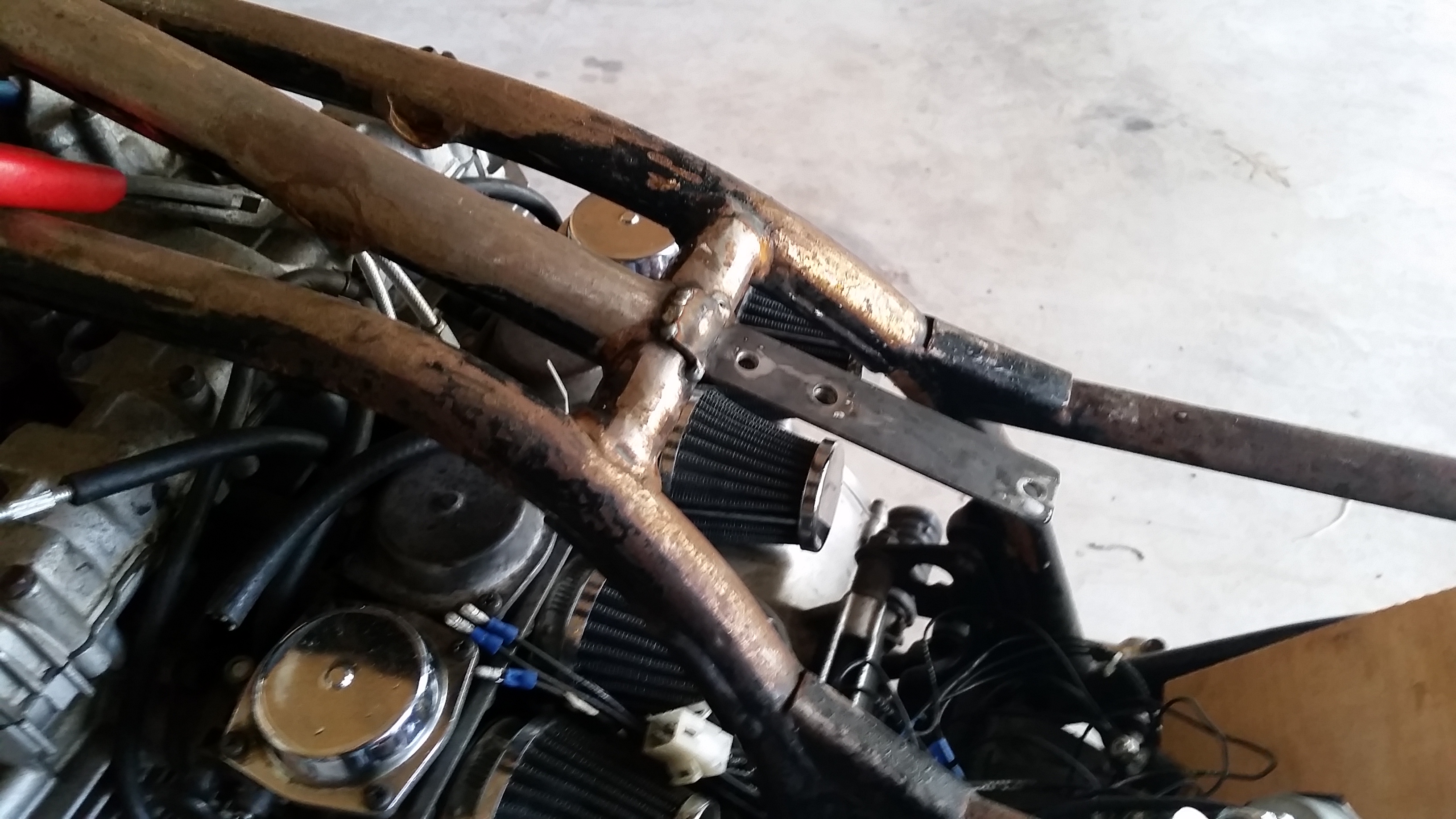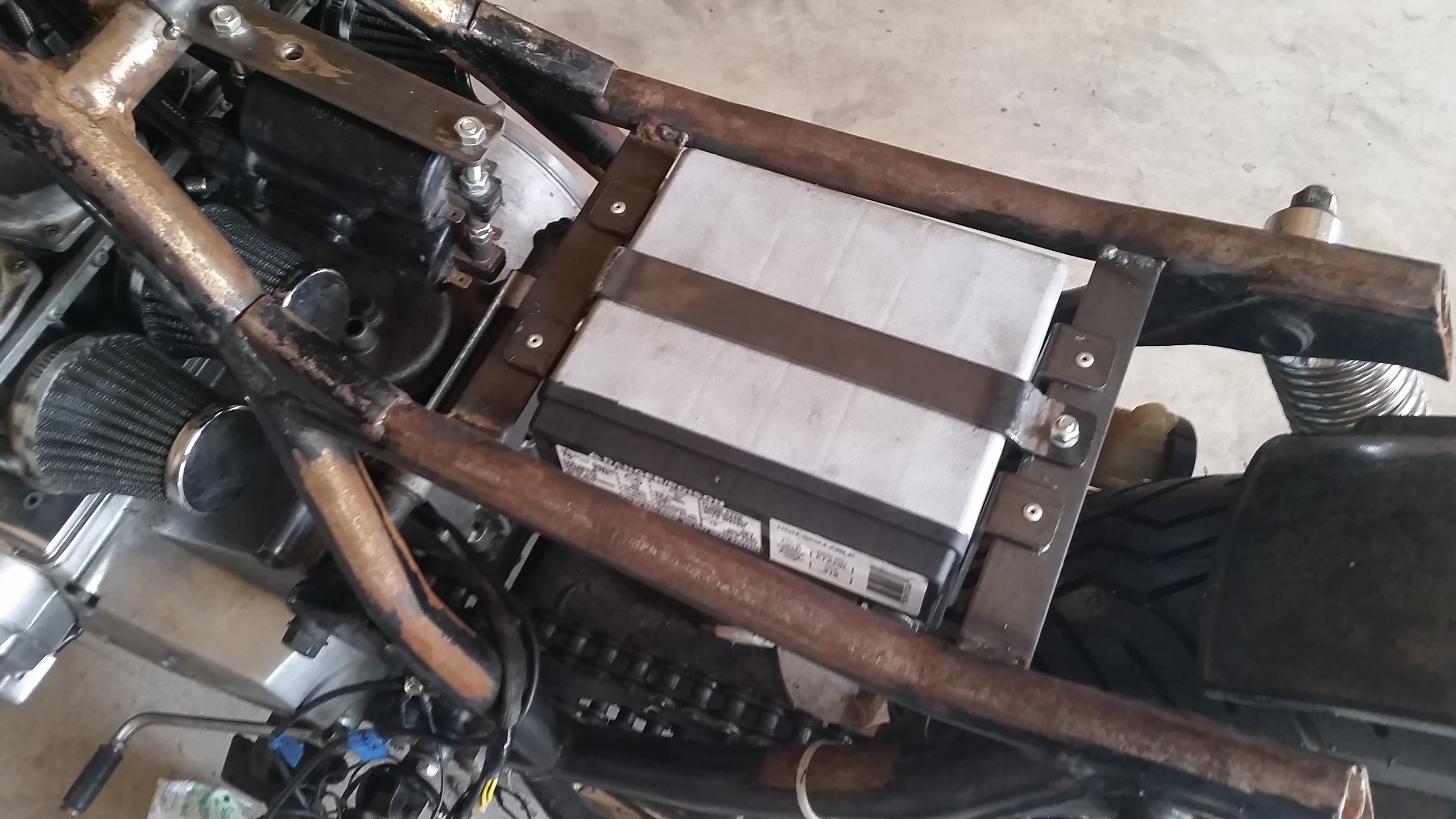 All the mounting tabs and brackets had been cut off as well as the frame behind the rear shock mounts. everything has to be fabricated. Mounted the tank and coil packs using one bracket off of the center and ran the wires forward to the plugs. Made a battery bracket under seat.