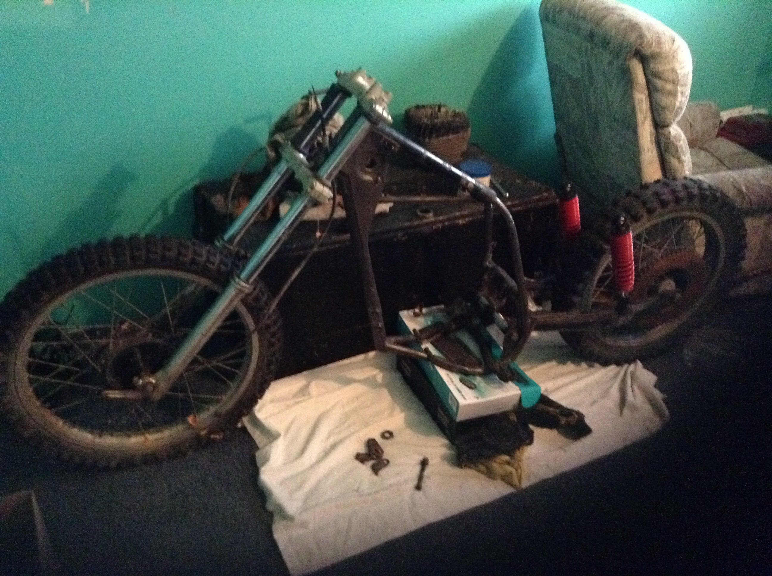 So I've decided against making her a hardtail. I don't have the area or the tools yet.so I found the original swing arm, and have some brand new shocks. So now I have to find some material to make a hoop and supports. Oh and I lost one of the caps on the swing arm, a lot of digging through parts to find it. And my back will love it being a softtail.
