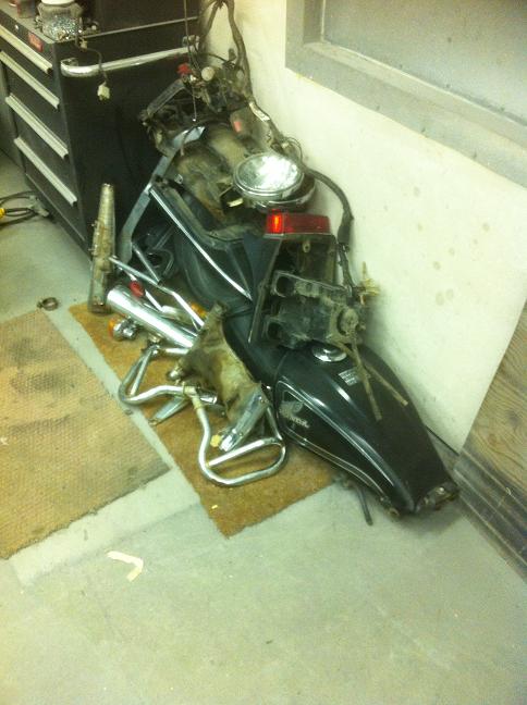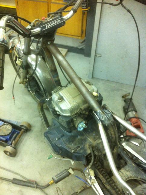 axelcrypt- Stamped frame.....ya, lots of fun. The sportster tank that's on the bike has a really small mounting tunnel, so I had two options: Make the tunnel bigger to fit the frame and sacrifice fuel capacity, or modify the frame. What went in the frame was a chunk of sched. 40 pipe that was laying in the dirt down the embankment in front of my parents house. How my dad remembered it was there, and how it happened to be the perfect diameter, I don't know. Saved me from buying a piece, though.