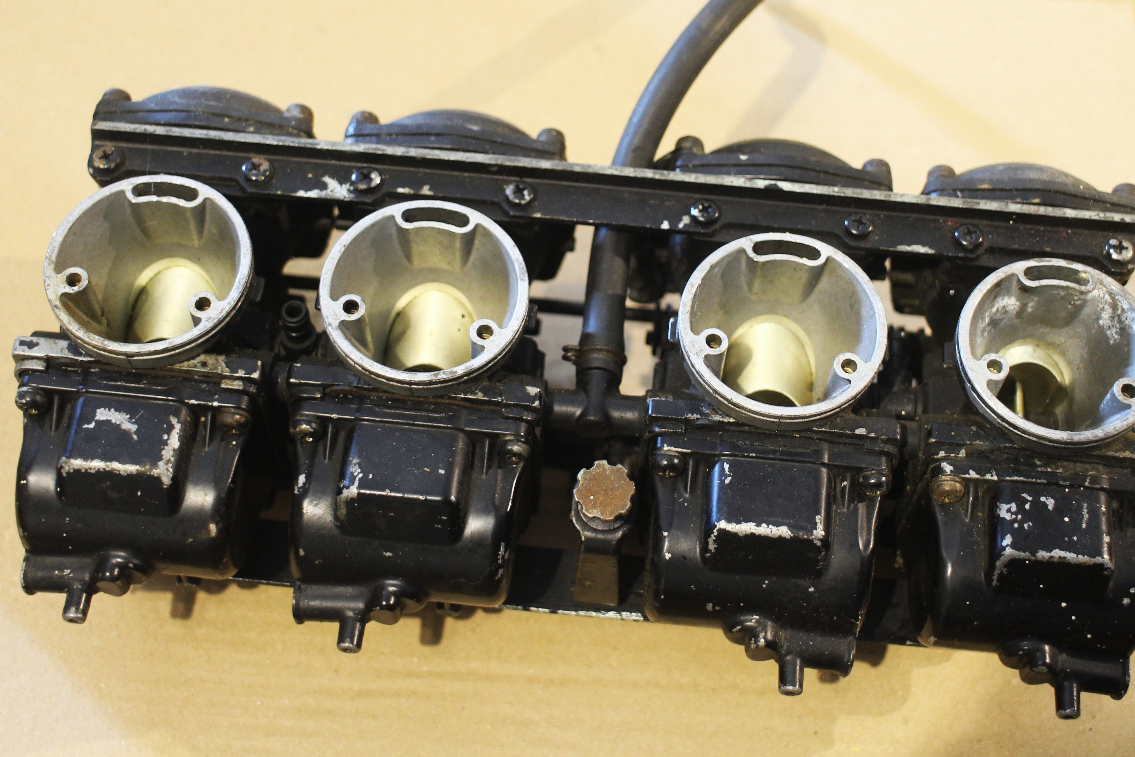 In the meantime took the Mikumi VM carbs apart, they were worse than I expected. The homemade black paint was peeling off, while one of the floats was badly damaged, one carb had a missing spring.. god knows how.