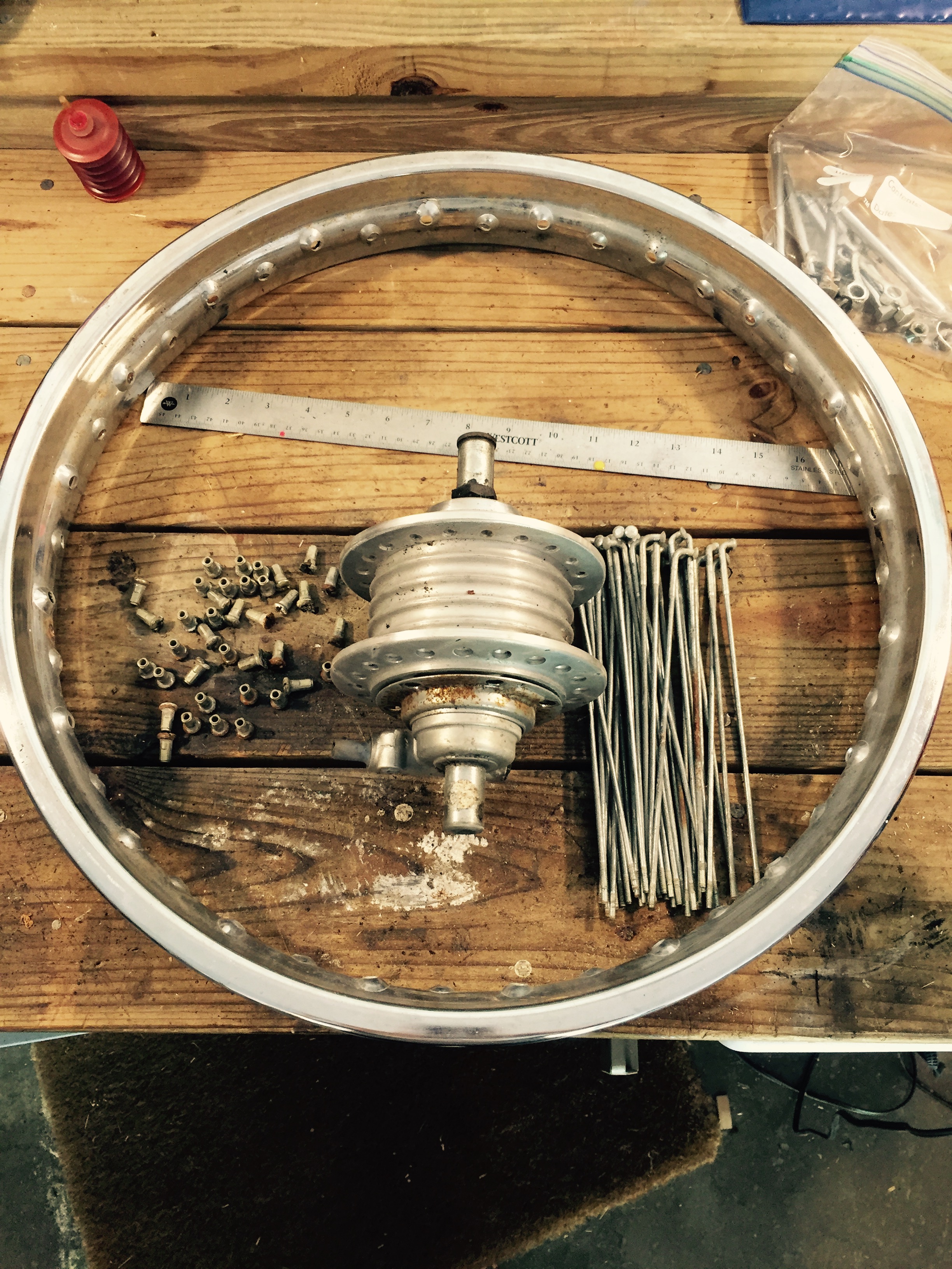 I found valves on ebay and then decided I might as well strip the bike down to the frame while I was almost there anyway. Removed wheels, fork and shocks, stripped the wiring harness out and organized it all into buckets and sip lock bags. Scrubbed the frame clean(ish). The oil on there is pretty thick and difficult to get off. Going to take another pass at it. I decided I want to make the wheels black, so I pulled the front apart to clean and get these rims ready for powder coating. Now that the front hub is off the bike I'm not sure how to pull the internals apart. I've done some searching on here, and looked through the manual, but am not able to find a good description of how to get them apart. I've got a bench vise and tried clamping the lock nut in there and turning the axle with screw drivers through the hole like it says in the manual, but it isn't budging. I would love to get it down to the hub so I can powder coat that too. Appreciate any help. I usually get about 1/2 an hour here or there, so work is going kind of slow. I was thinking that if I get the wheels done it will help me feel like I'm making some forward momentum.