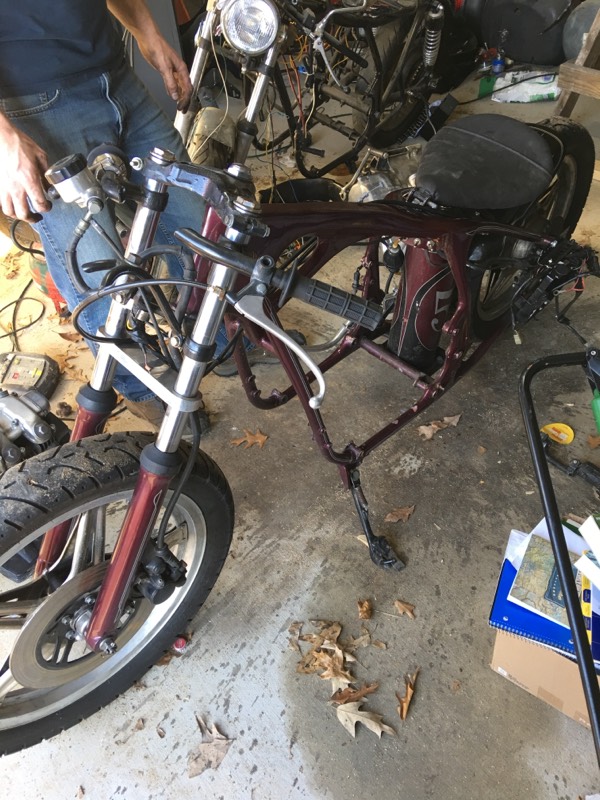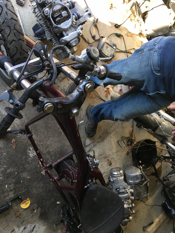 I've always wanted a hard tail bobber chopper. Last week I saw this hard tail frame on the local CL. Seller said he was selling it because the motor had locked up and he'd gone on to different things, it had a CB500 motor in it. I happen to have CB550 that I was working on making a cafe racer out of but the project is stalled and I've sort of lost interest. So what's gonna happen is I'm going to stick my motor in this thing and see try to get it going. There are some interesting things going on with this thing to sort out.