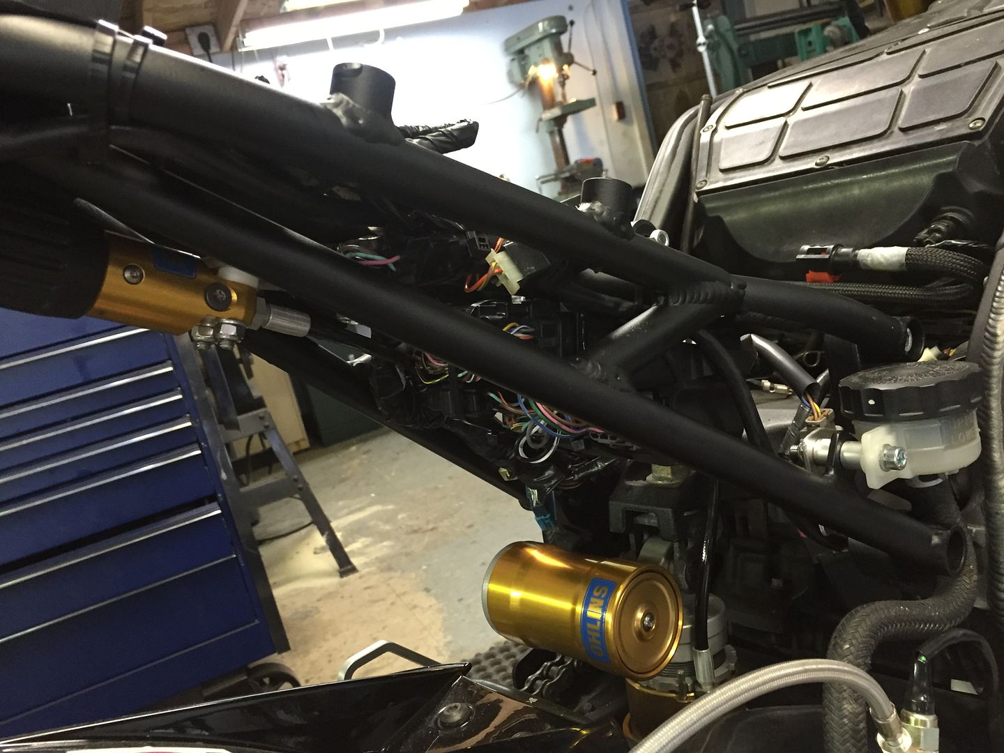 I also lucked into a little 'bling'. Brand new Ohlins shock and spring with remote adjustment. 8) Oh ya. The orange paint on the wheels had to go to. Black powder does the trick!