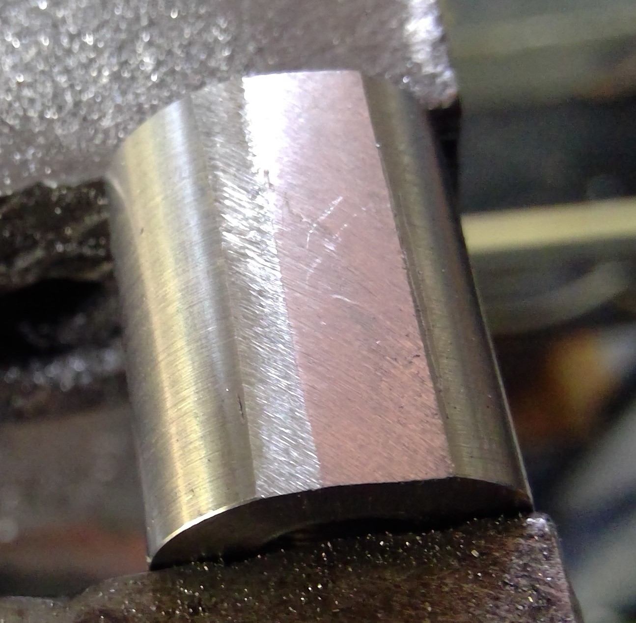 The rod and points were then assembled again on the bike. Once again with the timing set at 15 degrees BTDC, a line was scribed on the cam above and below the points heel, then I filed very carefully between the scribed lines and using a micrometer then filed down to around .30mm and the apex between first and second flats rounded over. The rod and cam were again assembled and the timing checked with a light connected between points and earth. I did this at least a dozen times until the light illuminated a few degrees before 15 degrees BTDC. Then used a nylon fibre wheel to smooth over the file marks and gradually lower the apex until the LED light s up at 15 degrees BTDC. I then rounded over the dwell apex until the light extinguished at 75 degrees ATDC. The engine then turned over 180 degrees and the process repeated for the second lobe. Then the cam was polished.