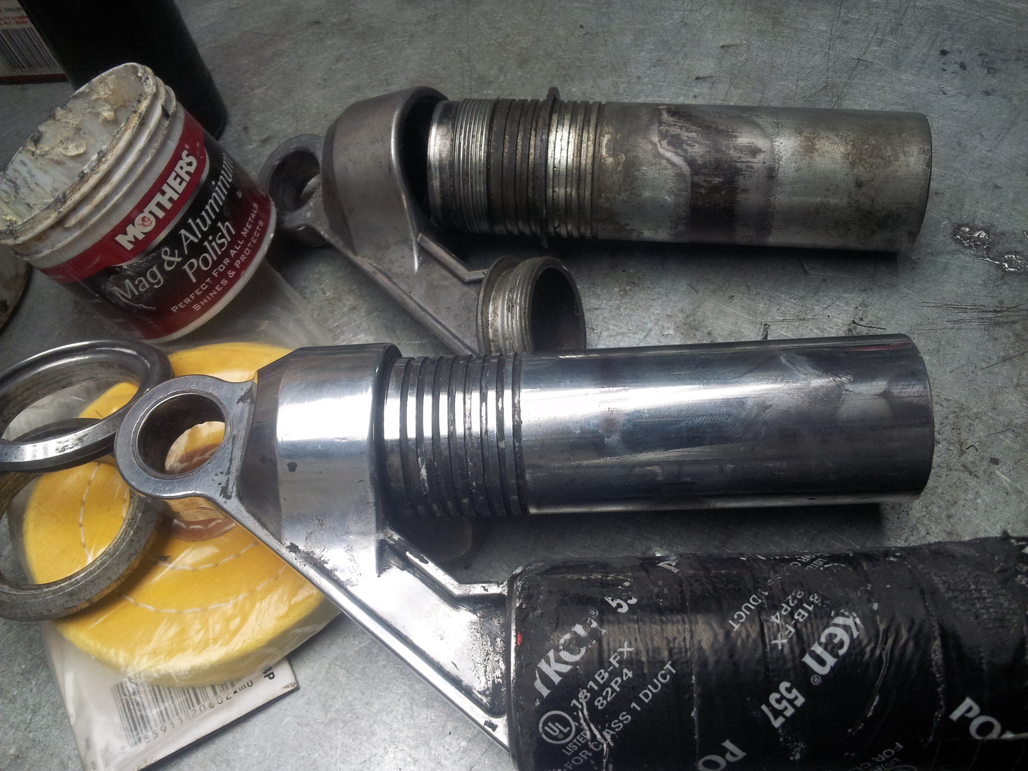 also, as you can see in the photo, the shocks surprisingly polished up very quickly to a mirror finish on the aluminum parts, and the steel main cylinder apparently was zinc plated or something, which also polishes up to almost chrome. I was tempted to use the same black epoxy paint for the main cylinder where the spring bushing rubbed the plating off, consequently leaving a rusted marks and no plating. Unfortunately I think that paint may just rub off again, and black may show the wear much faster, although it the black paint is much tougher epoxy paint and it is a Teflon or nylon bushing that separates the two springs. I am undecided on this, as I cannot get silver paint an epoxy form, only in brake caliper paint or lessers. I am wondering if the black will look good and break up the space a little bit, or if it will look odd painting the main cylinder below the spring perch and clip grooves, leaving the top half with the original finish buffed to a high polish. I knew putting on the clips would scratch the black paint off immediately, so I decided that I would only paint below that, whether it is silver or black.if the original finish was not worn down completely to expose the bare metal and let it rust, I would have just buffed the entire thing & been very happy.