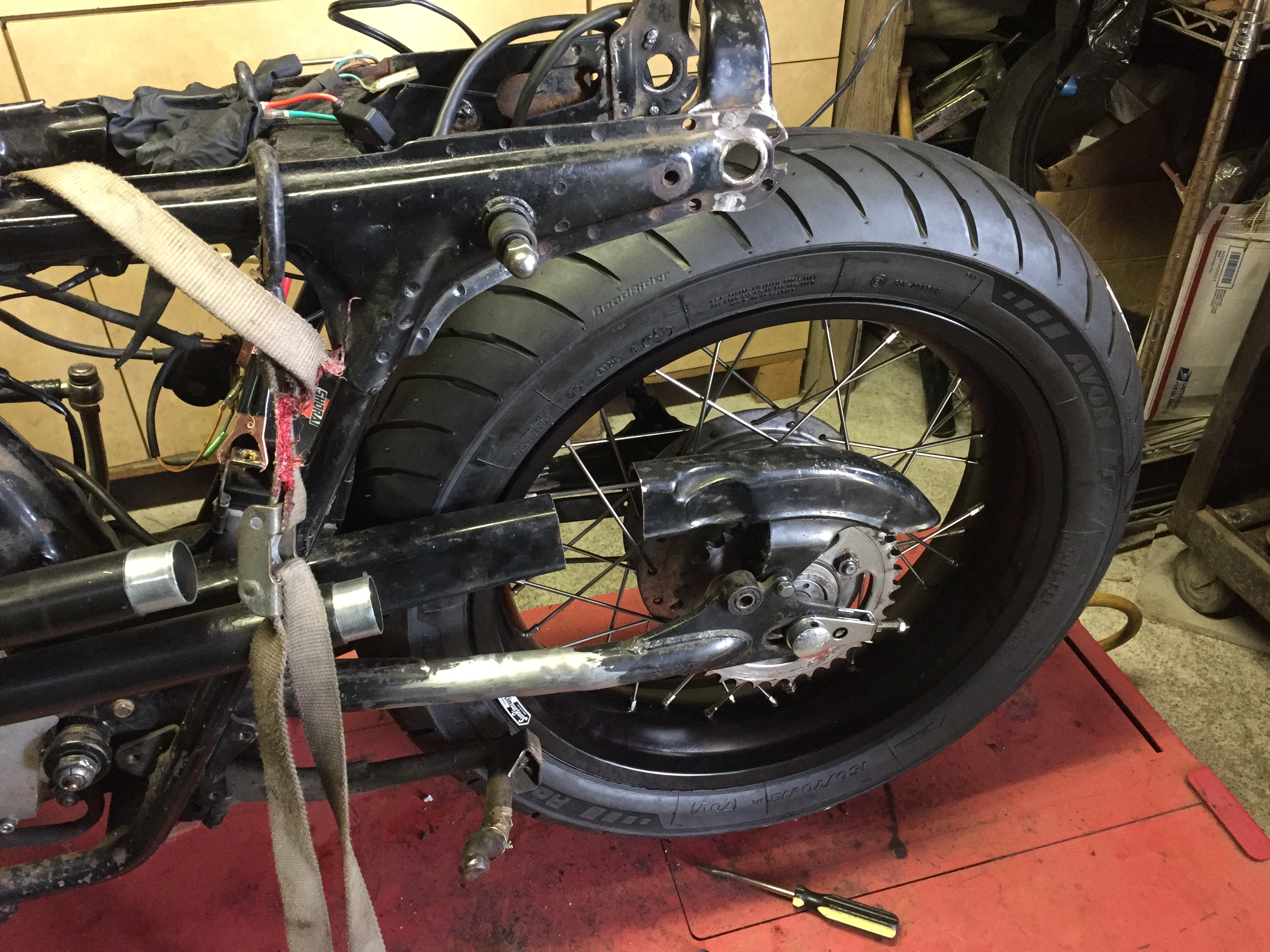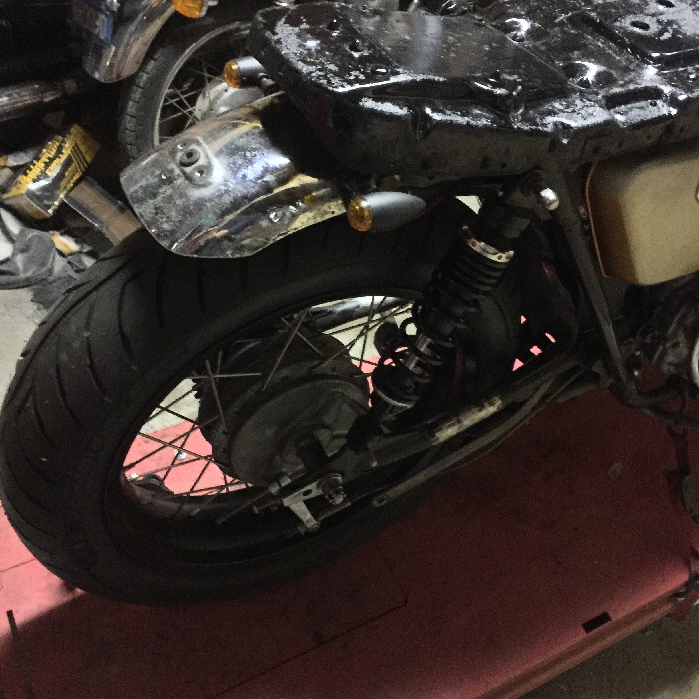 Hey everyone just figured I should post this info for those interested in doing custom wheels on their cb/cl350 with stock forks. I'm building a 71 cl 350 and I decided to make it a bit more modern because..... I can ;D. So recently ordered a 3.50x18 sun rim from Cognito moto and I mounted a 120/70-18 shinko tire, not the brand I was looking for but it was in my price range and was the size i wanted the clearance between both sides of the tire walls and the forks are about 5 mm each side. As for the spokes I ordered them off a ebay supplier who sells spokes for cb350 rims which are stainless steel I believe it cost $60 for each rim, the front wheel is mounted on a drum hub and the spokes length are 155 mm I had them custom made for the rim and hub combination also had them make the thread length as long as they could which was only about 35 mm in case I had to shorten the spokes. I was going to do the front fork conversion but realized that it would cost a lot more and It could take too long for me to finish and I really want to ride the bike as soon as possible. My goal is to make it a clean bike and once done hopefully it will look as if it came from the factory once completed. I'm hoping to have the rear wheel in by the end of the year and I am thinking about going with a 4.25x18 sun rim for the rear. hope this helps anyone who wants to install a wider wheel on their cb/cl350.